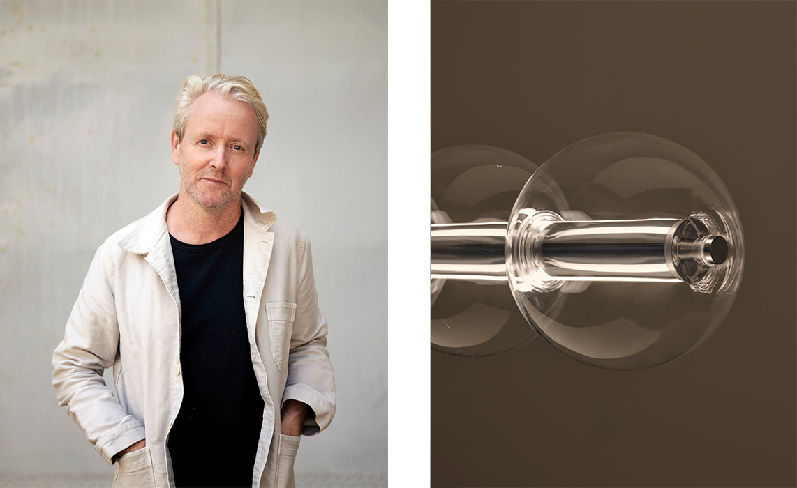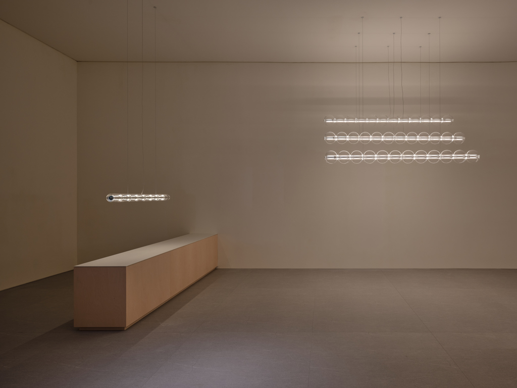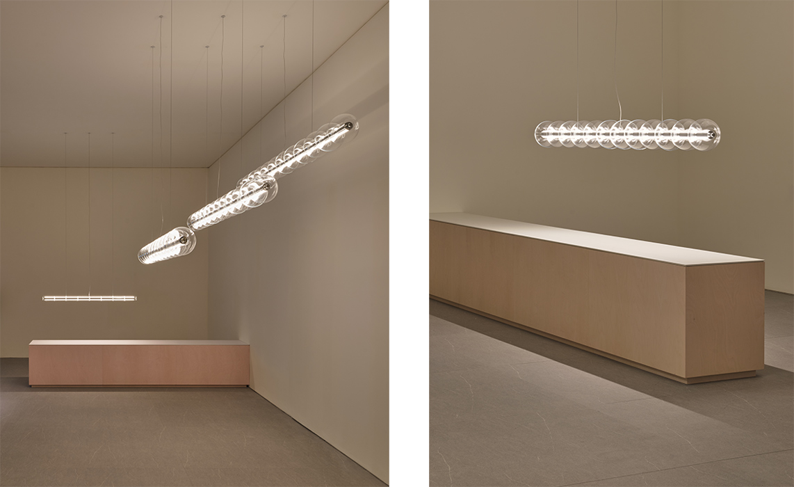 “Luce Sferica es una lámpara que busca la delicadeza y la belleza de la sencillez, como gotas de lluvia que se aferran a un hilo o una pompa de jabón soplada por un niño. Sobre la base sintética de aluminio extruido, se deslizan esferas de vidrio soplado, como si una burbuja se posara sobre un hilo. Aquí prevalecen la suavidad, la magia y la sofisticación técnica. Un objeto de gran precisión técnica que expresa delicada belleza y poesía, más que mecánica sintética”, detalla Ronan Bouroullec.