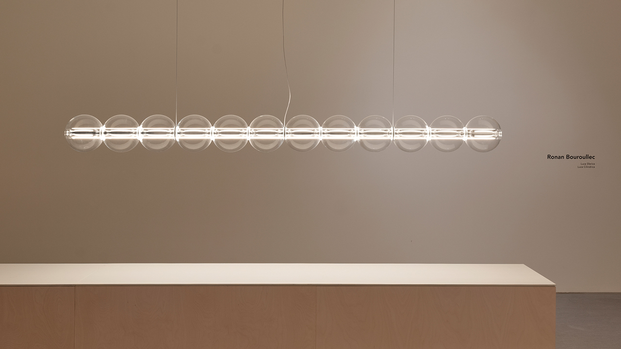 “Luce Sferica es una lámpara que busca la delicadeza y la belleza de la sencillez, como gotas de lluvia que se aferran a un hilo o una pompa de jabón soplada por un niño. Sobre la base sintética de aluminio extruido, se deslizan esferas de vidrio soplado, como si una burbuja se posara sobre un hilo. Aquí prevalecen la suavidad, la magia y la sofisticación técnica. Un objeto de gran precisión técnica que expresa delicada belleza y poesía, más que mecánica sintética”, detalla Ronan Bouroullec.