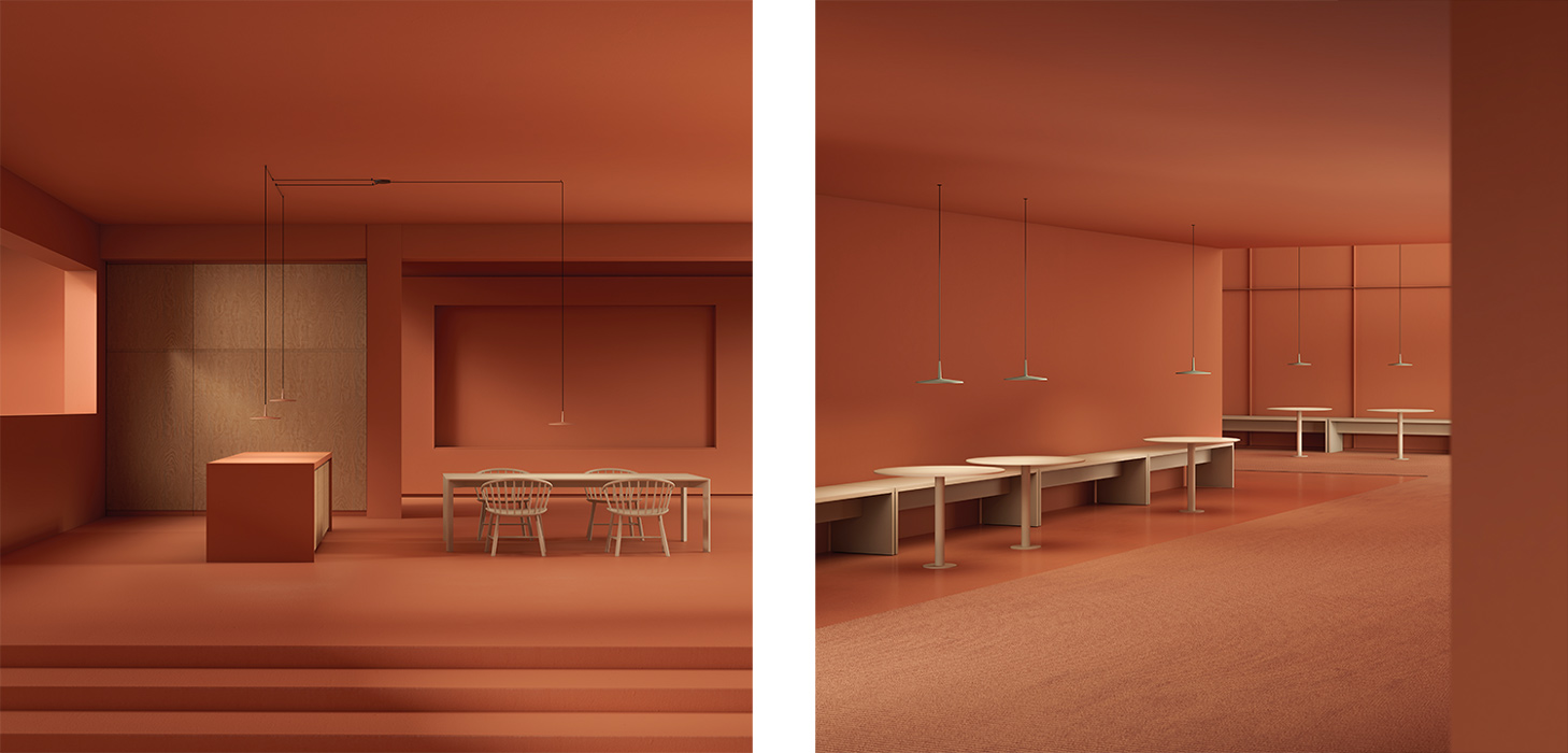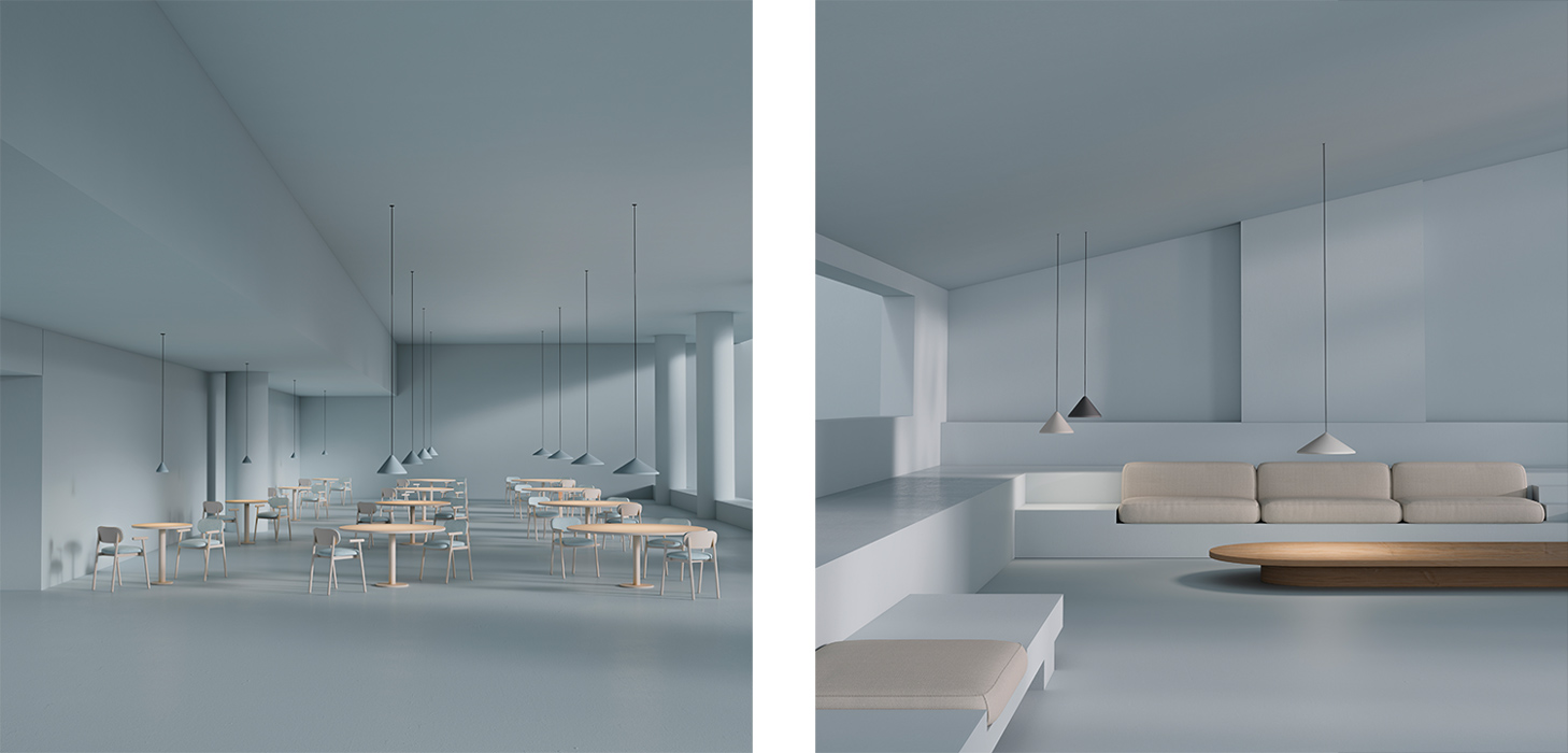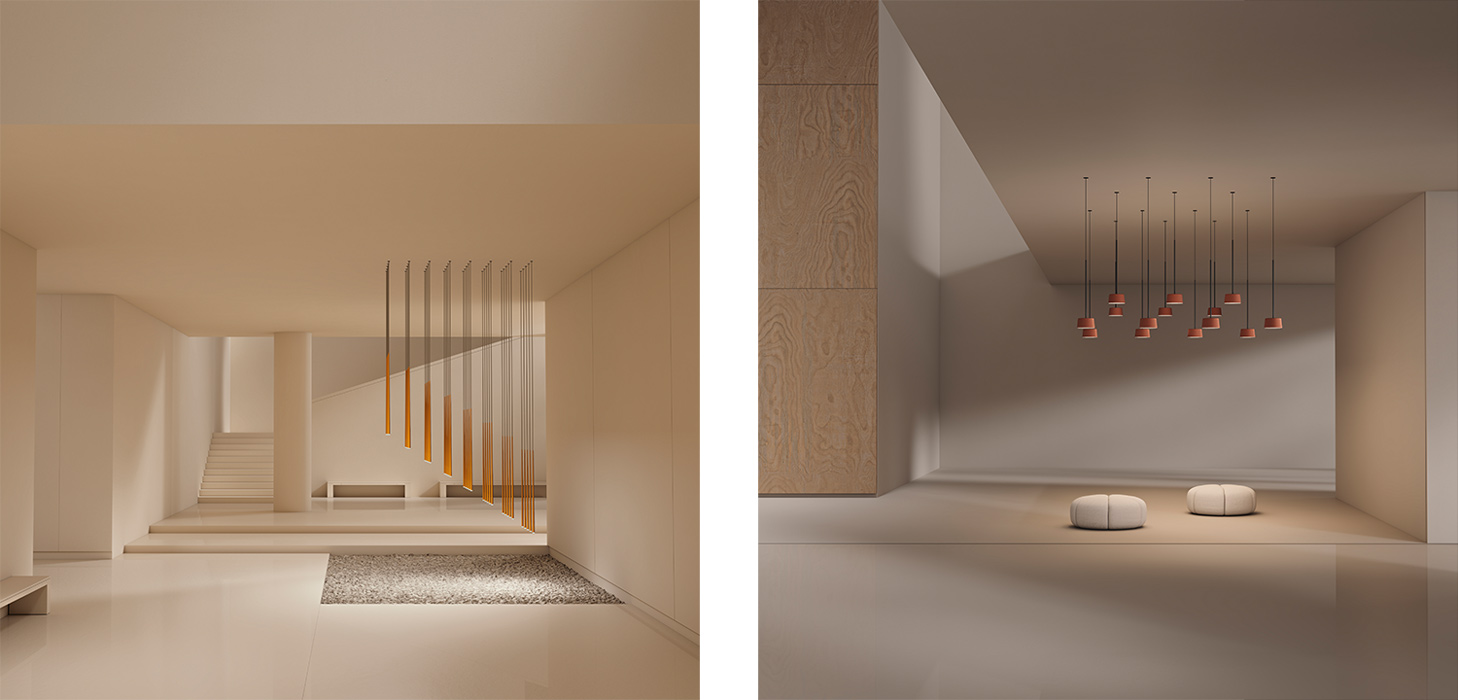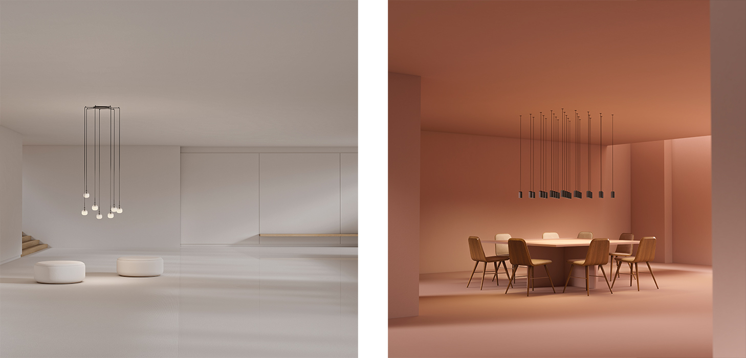 El sistema está pensado para trabajar con diez luminarias de suspensión del catálogo de la marca, lo que permite combinar diferentes modelos dentro de una misma instalación. Esta compatibilidad facilita la creación de composiciones más variadas y adaptadas a cada proyecto, permitiendo organizar las luminarias en configuraciones individuales o grupales según las necesidades funcionales y estéticas del espacio.