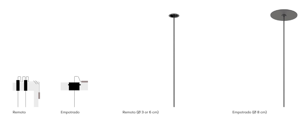 El sistema se adapta a distintos tipos de techos mediante cuatro configuraciones de instalación: remota, empotrada, de superficie y free wire. Cada una responde a las condiciones constructivas del edificio y al grado de intervención que permite la arquitectura.