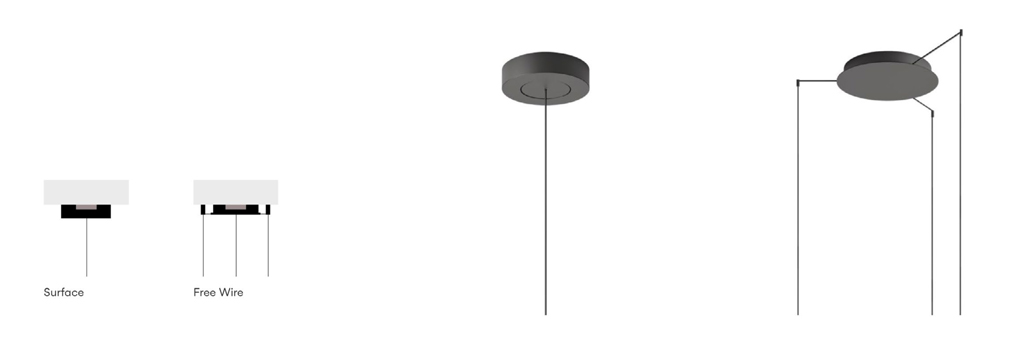 Cuando el techo no permite intervenciones internas (No Registrable), el sistema contempla soluciones de superficie que concentran la conexión eléctrica en un único punto visible. A partir de ese punto, los cables pueden distribuirse hacia diferentes posiciones de suspensión. La variante free wire amplía estas posibilidades permitiendo que los cables recorran el techo de forma visible, generando trayectorias que se integran en la propia composición lumínica.