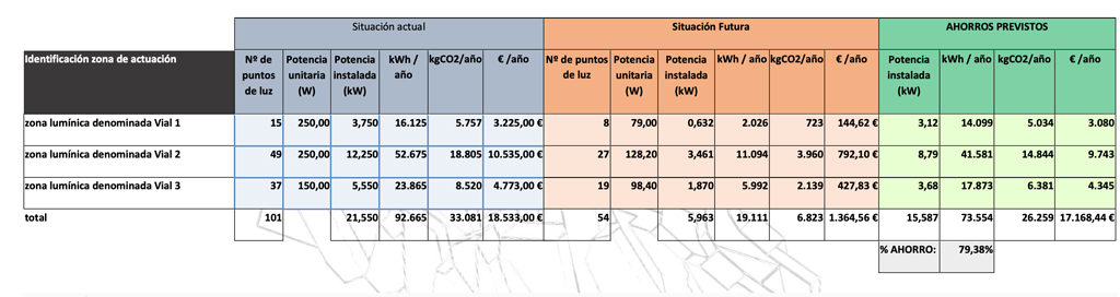 La actuación permitirá alcanzar una mejora de la eficiencia energética superior al 79 %, con un ahorro anual estimado de 73.554 kWh, que se traducirá en una reducción de más de 26 toneladas de emisiones de CO₂ y en un ahorro económico superior a 17.000 euros al año. A estos resultados se suman ventajas significativas en durabilidad, reducción de mantenimiento y calidad lumínica, logrando niveles de uniformidad y confort visual plenamente acordes con los estándares técnicos actuales. En la siguiente tabla puede ver las estimaciones de ahorro que se pretenden conseguir con el proyecto: