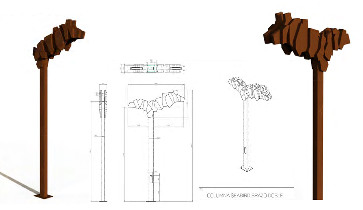 Con este propósito, se ha encargado el diseño de las nuevas columnas al escultor gallego Elías Cochón Rei. El resultado es la columna SEABIRD, una pieza concebida como elemento escultórico y funcional a la vez. Su diseño consta de una columna compuesta por fuste metálico coronada con elemento ornamental y escultural, diseñado y desarrollado específicamente para este conjunto y que sirve, a su vez, de sujeción y alojamiento de la luminaria.