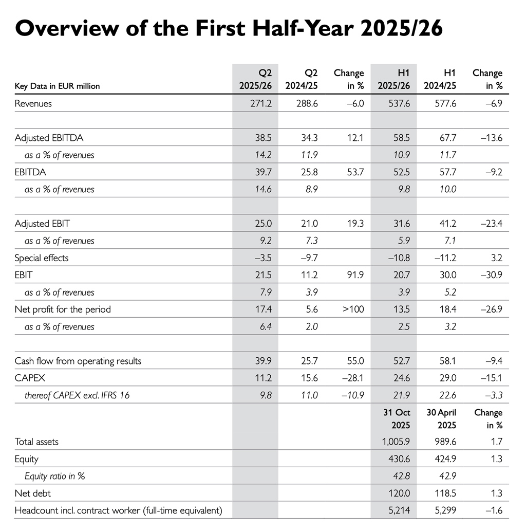 Con base en este escenario de incertidumbre, el Consejo de Administración mantiene sus previsiones de una caída de los ingresos en el rango de un dígito y de un margen EBIT ajustado de entre el 1% y el 4% para el conjunto del ejercicio fiscal 2025/26.