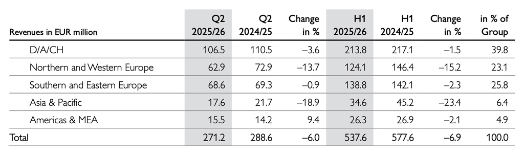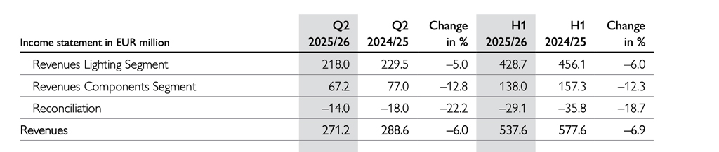 En el Segmento de Iluminación, los ingresos descendieron un 6,0% durante el primer semestre del ejercicio 2025/26, hasta situarse en 428,7 millones de euros, frente a los 456,1 millones registrados en el mismo periodo del año anterior. Las aportaciones positivas procedentes de algunas áreas de la región D/A/CH, así como del sur y del este de Europa, no fueron suficientes para compensar la menor demanda observada en el norte y el oeste de Europa ni en los mercados asiáticos.